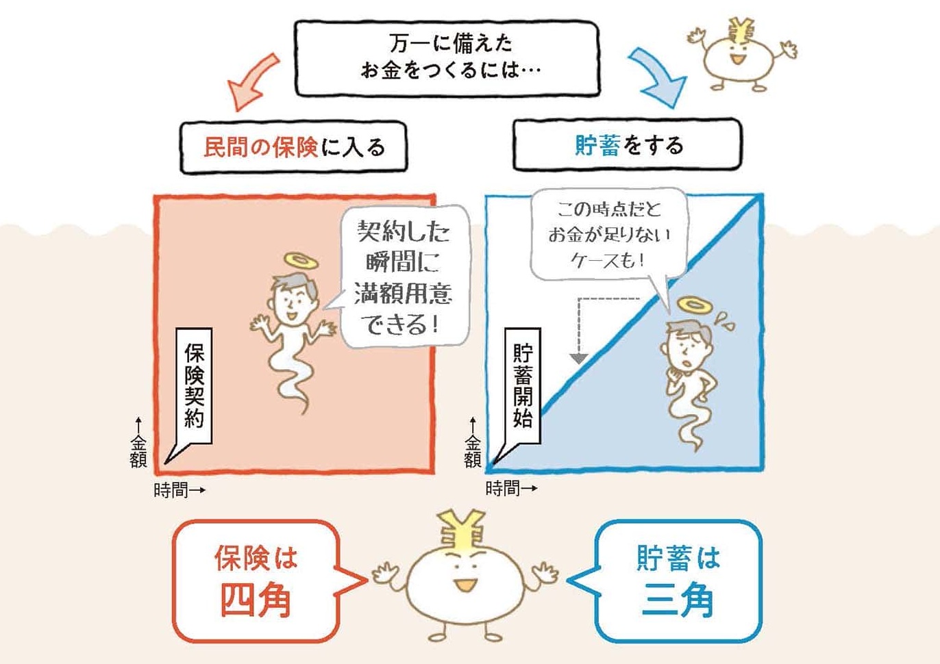 そのため多くの人は万一に備えて民間の保険(私的保険)に入ります。ここで知っておきたいのが「貯蓄は三角、保険は四角」という言葉です。