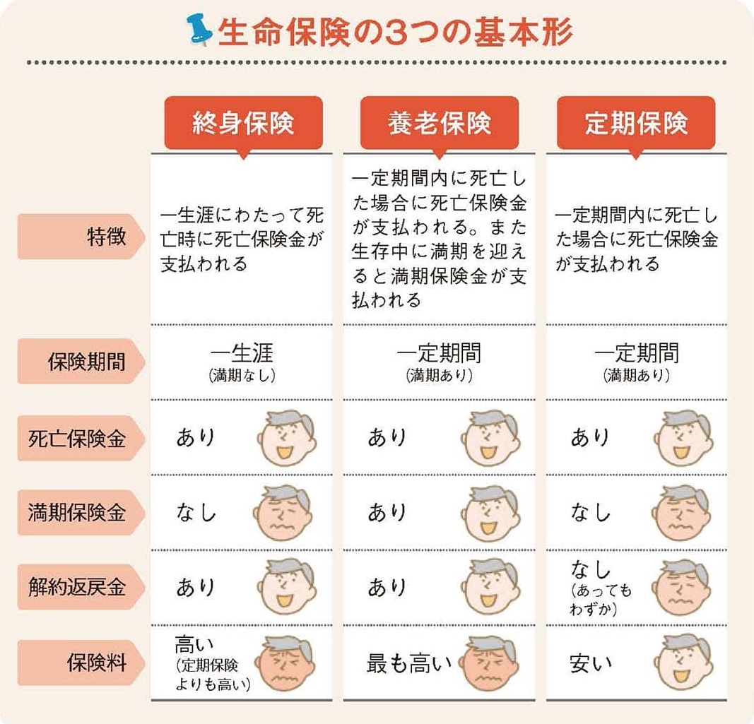 生命保険には、終身保険、養老保険、定期保険という3つの基本形があり、それぞれの特徴は上のとおりです。