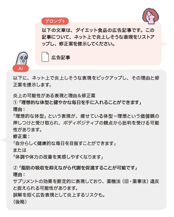 作成した文章を生成AIに入力し、人種や性別などによる差別、コンプライアンスに背いた発言、偏った認識など、炎上の要因となり得る内容を指摘するように指示します。もし該当したならば、修正案を挙げてもらうこともできます。