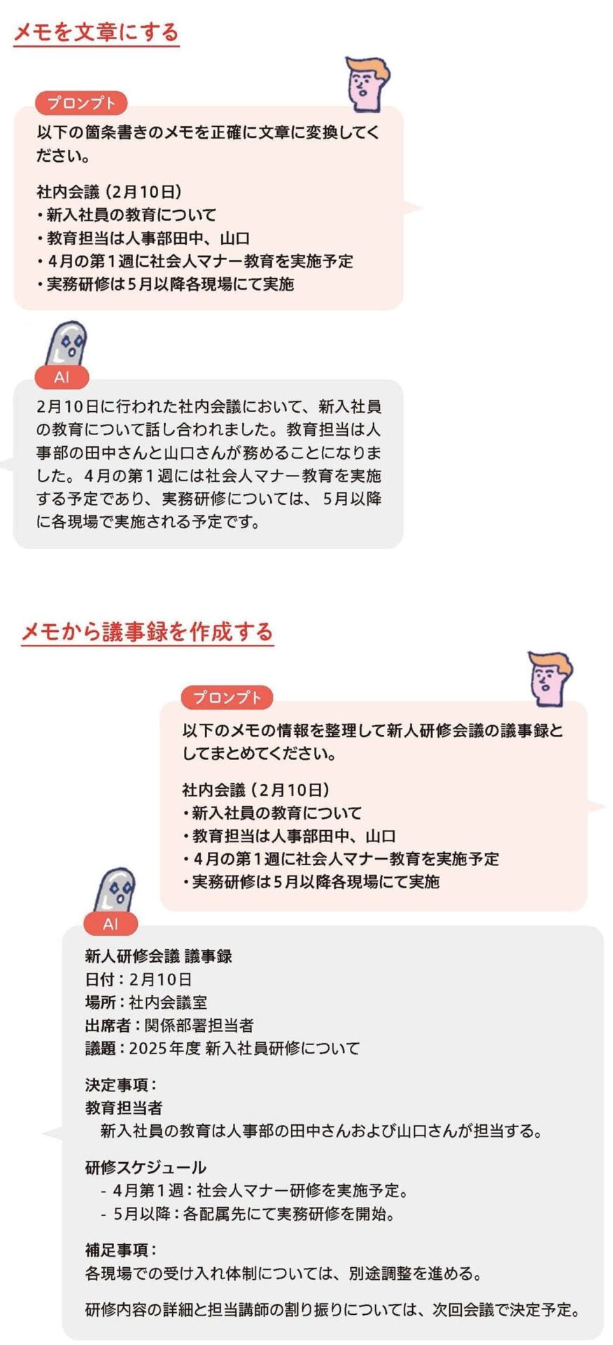 また、生成AIは長い文章から要点を抜き出して要約するのが得意ですが、その逆でメモや箇条書きの記述などから文章を生成することもできます。