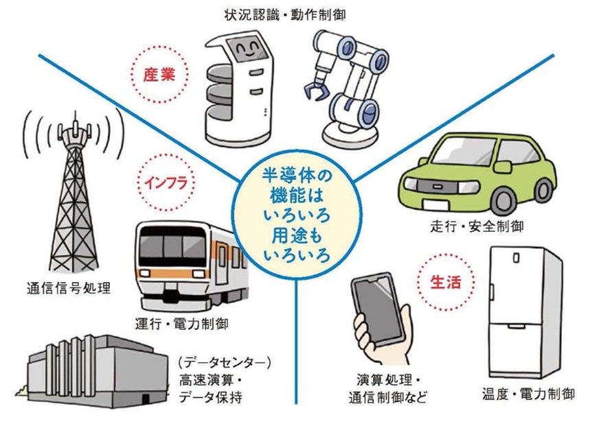 スマートフォンやパソコン、身の回りの家電をはじめ、自動車や産業機械、通信網やインフラなど、電気で動く無数の機器に半導体は使われています。