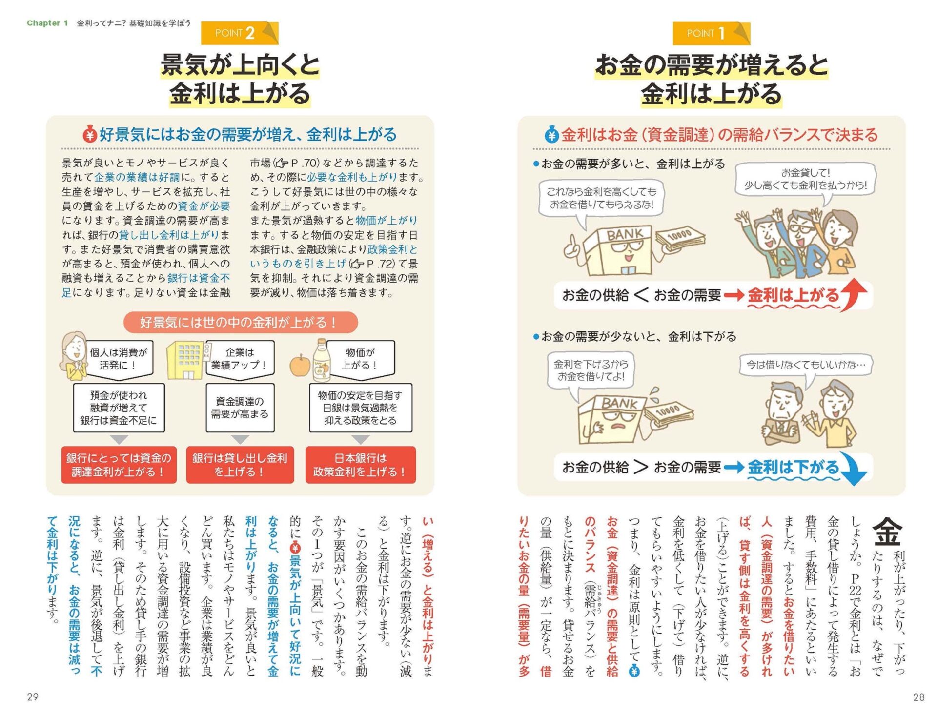 そもそも金利とは、貸し借りしたお金に対して受け取る(支払う)対価のこと。お金を借りたい人や企業の「需要」と、貸し出せる資金という「供給」のバランスで決まるため、需要が増えると金利は上がりやすい。たとえば、物価が上昇すると、消費者は値上がり前に購入しようとして消費が増え、企業は生産や投資を拡大するために資金を必要とする。その結果、お金の需要が高まり、金利が上昇する方向に働く。本書ではそんな基本から解説されている。イラストと図解を見れば、「全く知識がない」という人にとっても、理解しやすいだろう。