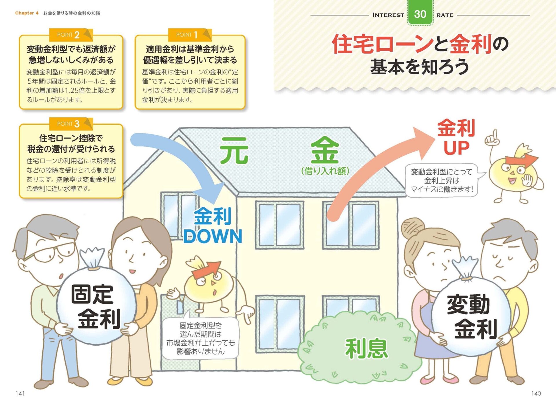 金利の話でまず不安に感じやすいのが住宅ローンだ。住宅ローンの商品には変動金利型と固定金利型があり、当初の金利が低いことから、変動型を選ぶ人は多い。固定型なら金利が上がっても返済額への影響はないが、変動型は金利上昇が負担の増加につながる。本書では、そんな住宅ローンをはじめとする、お金を借りる時の金利についての知識も詳しく解説されている。変動金利型でも返済額が急増しない「5年ルール」や「125%ルール」、住宅ローン控除の仕組み、借り換えの注意点など、今、おさえるべき要点が整理されている。