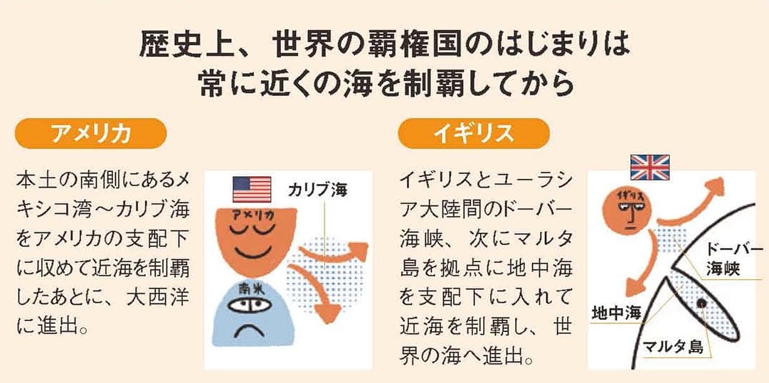 歴史を振り返ると、世界の覇権国は例外なく、まずは自国周辺の海を押さえることから影響力を広げていきました。アメリカはメキシコ湾からカリブ海を事実上の支配下に置いた後、大西洋へ進出しました。イギリスもまた、ドーバー海峡やマルタ島を拠点に地中海を掌握し、その後、世界の海へと勢力を広げています。
