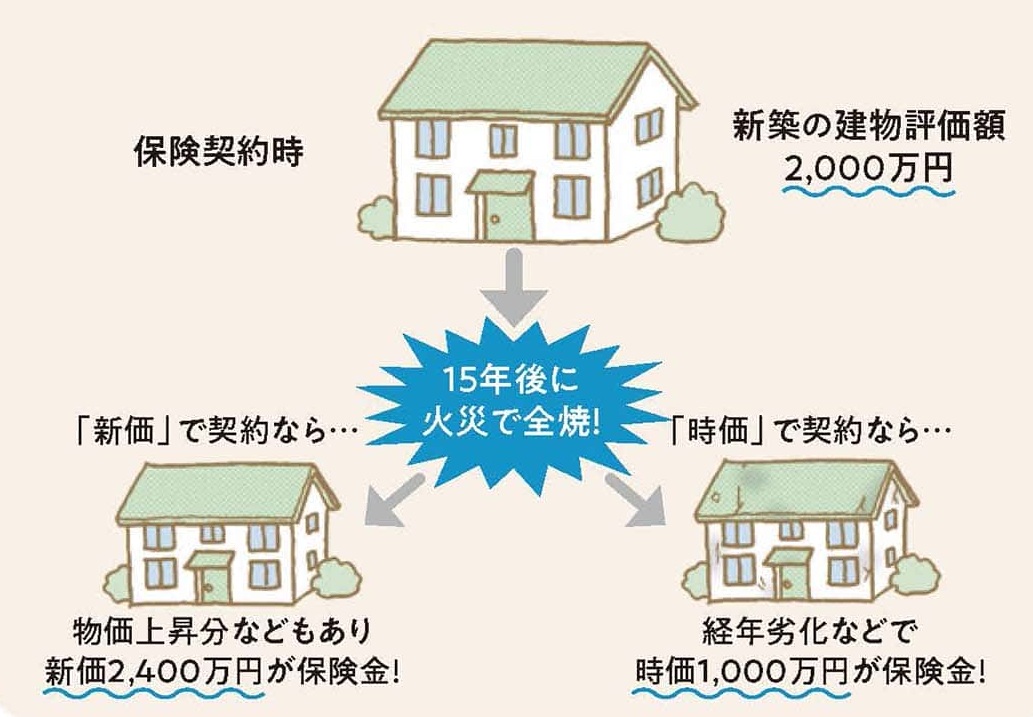 いまの火災保険は新価で保険金額を設定するものが主流ですが、古いタイプの保険の中には時価のものもあるので注意しましょう。